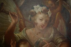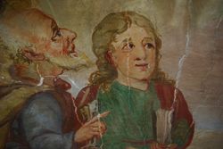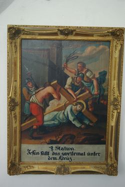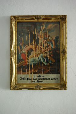 Malschichtabblätterungen an einem Kreuzwegstationsbild.