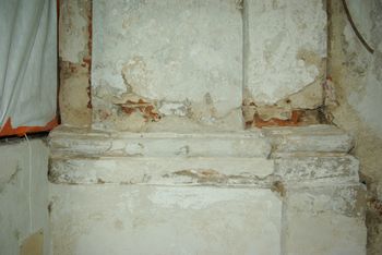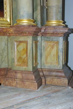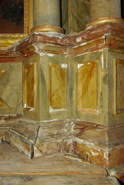 Altarpredella mit schweren Schäden an Holzsubstanz, Marmorierung und Vergoldung.