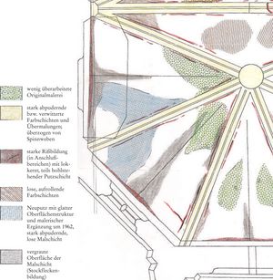 Gewinnung der Kenntnis über zurückliegende Farbgebungen durch Freilegeabtreppungen an verschiedenen Bauteilen von Raumschalen oder gefassten Ausstattungsstücken.